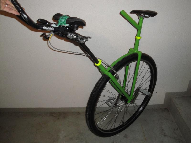 The handlebar comes off easy for trail riding, with a quick swap in of a short piece of plain tubing for a brake handle mount.