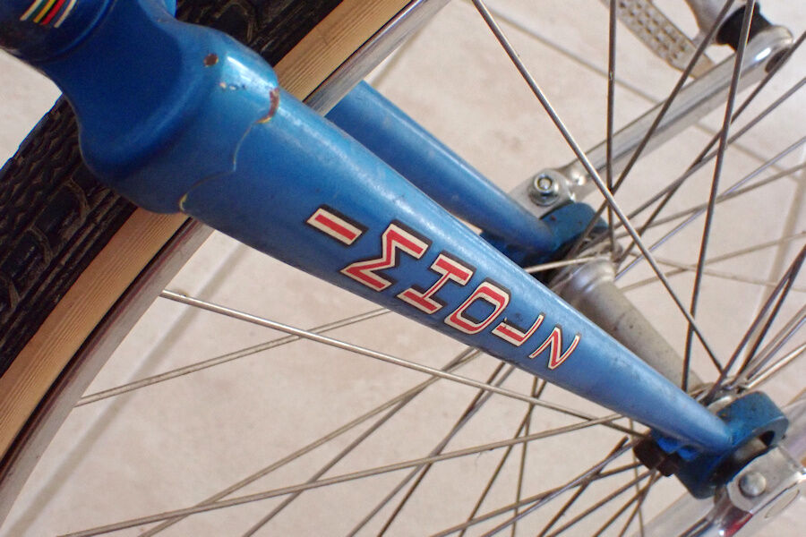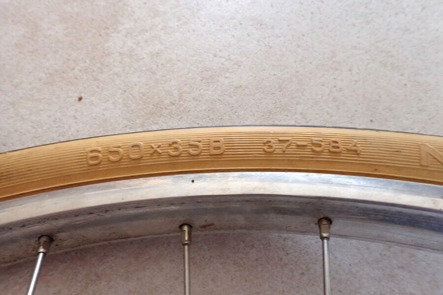 The spokes are stainless steel by DT Swiss, probably meaning that the wheel has been rebuilt or exchanged at some point in time - DT Swiss was only founded in 1994. The uni features a rather narrow (27.3mm OD) aluminium rim with a 37-584 tyre - yes, this is a 27.5er which is probably half a century old.