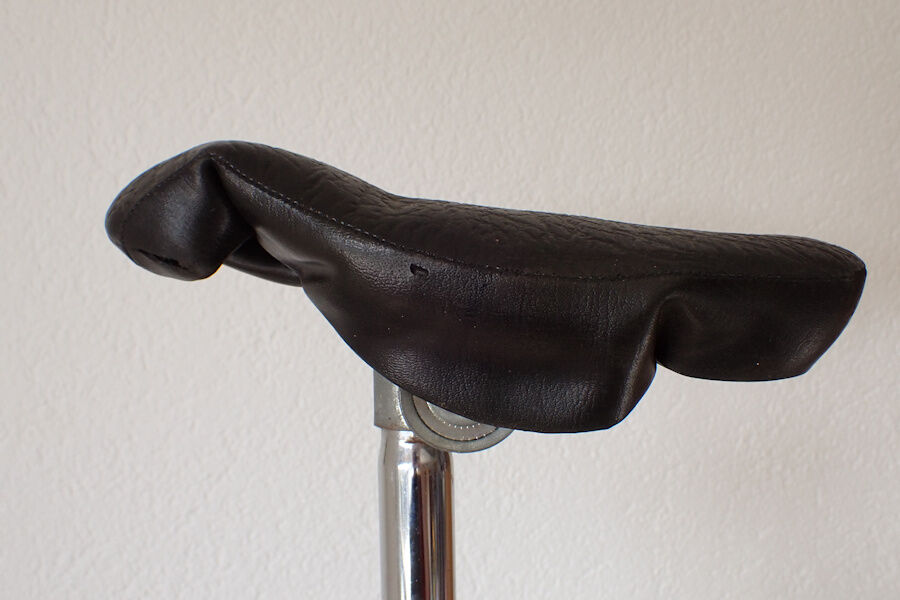 I’d like to replace the seatpost with a lighter aluminium seatpost, but the diameter is 25.0mm. Tried to insert a 25.4mm one, but it doesn’t fit, indeed. So I could turn down the bottom part of a 25.4er. Or I could make a shim that allows me to use a 22.2er - I’m not concerned about stability or rigidity, after all the whole uni is quite filigrane, thus doesn’t lend itself for rough riding anyway (the cottered cranks only underline this assessment). The third option is to use the existing seat post and just replace the seat. The old seat is riveted to the adapter, but rough measurements indicate that the holes match the pattern of modern seats pretty much perfectly. And if needed, I can always drill, mill or file to make things fit…