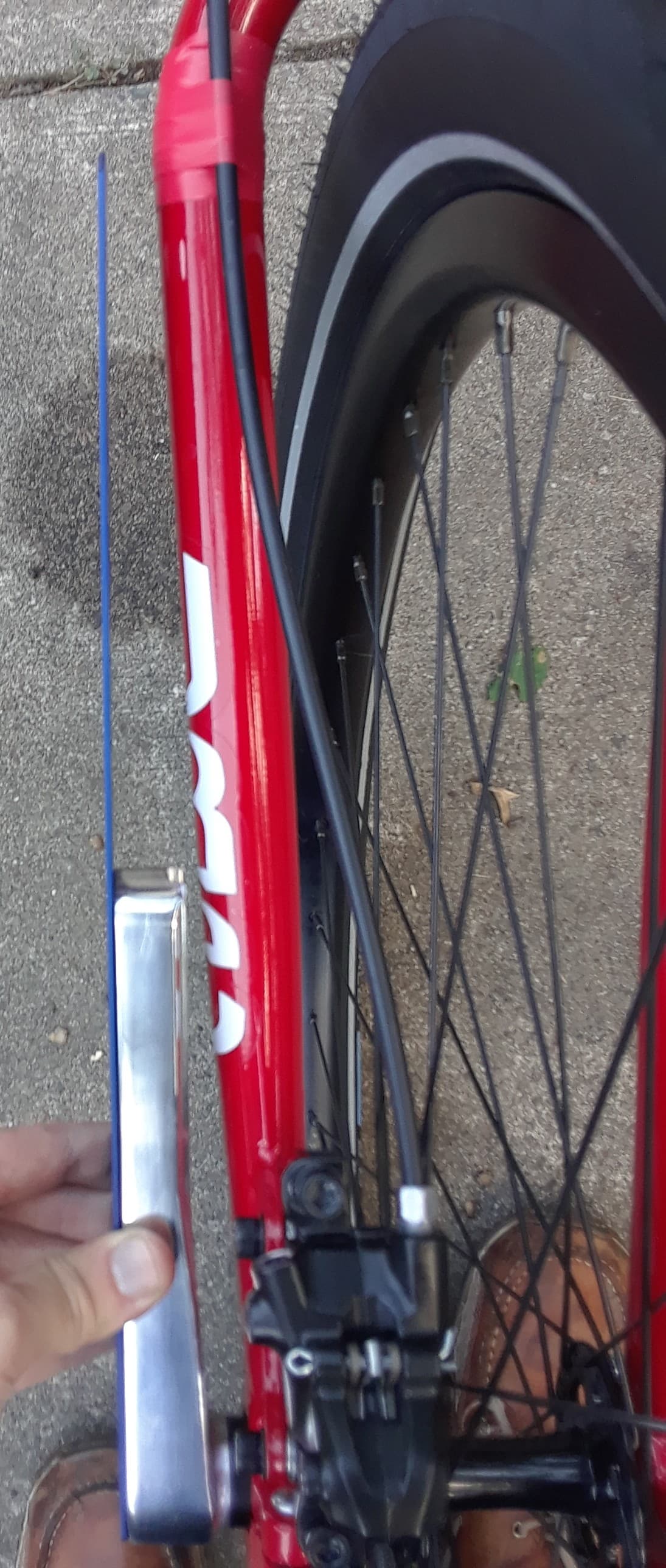 - Take the wheel out and stick the seat post in from the underneath (sans seat…) so it is in between the legs of the fork and just eyeball it to see if it looks parallel to the legs.