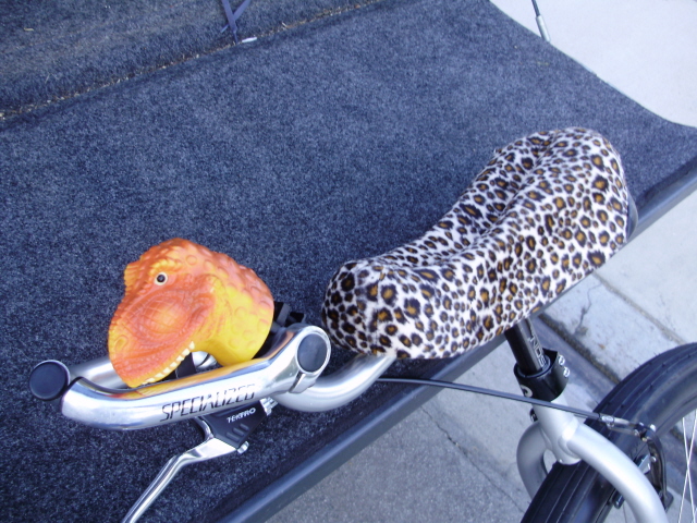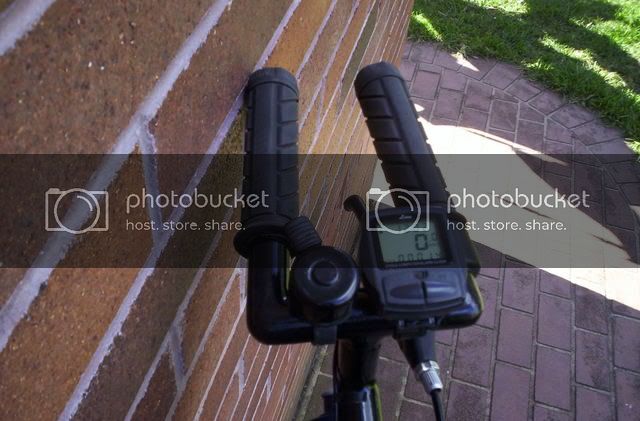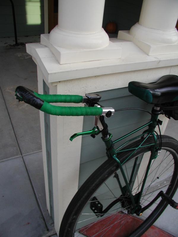 I really like these aero bars. They allow me to reach out farther forward. Thanks to the “seat post” mount there is no flex in them when I pull up on them while climbing hills. I set the “seat post” clamp (really the handlebar clamp) just loose enough so that when I UPD the handlbars can move enough not to break. As you can see from the torn tape at the tip of the aero bars, I’m not a stranger to UPDs. Another thing I like about these is that they are narrow enough not to bang up my thighs when I do go cartwheeling off the front. There’s space enough to mount my b*ke computer. When I’m riding at night I wrap a head lamp around the bars and I’ve got a head light.