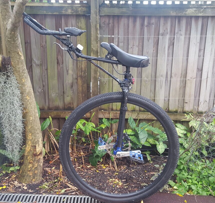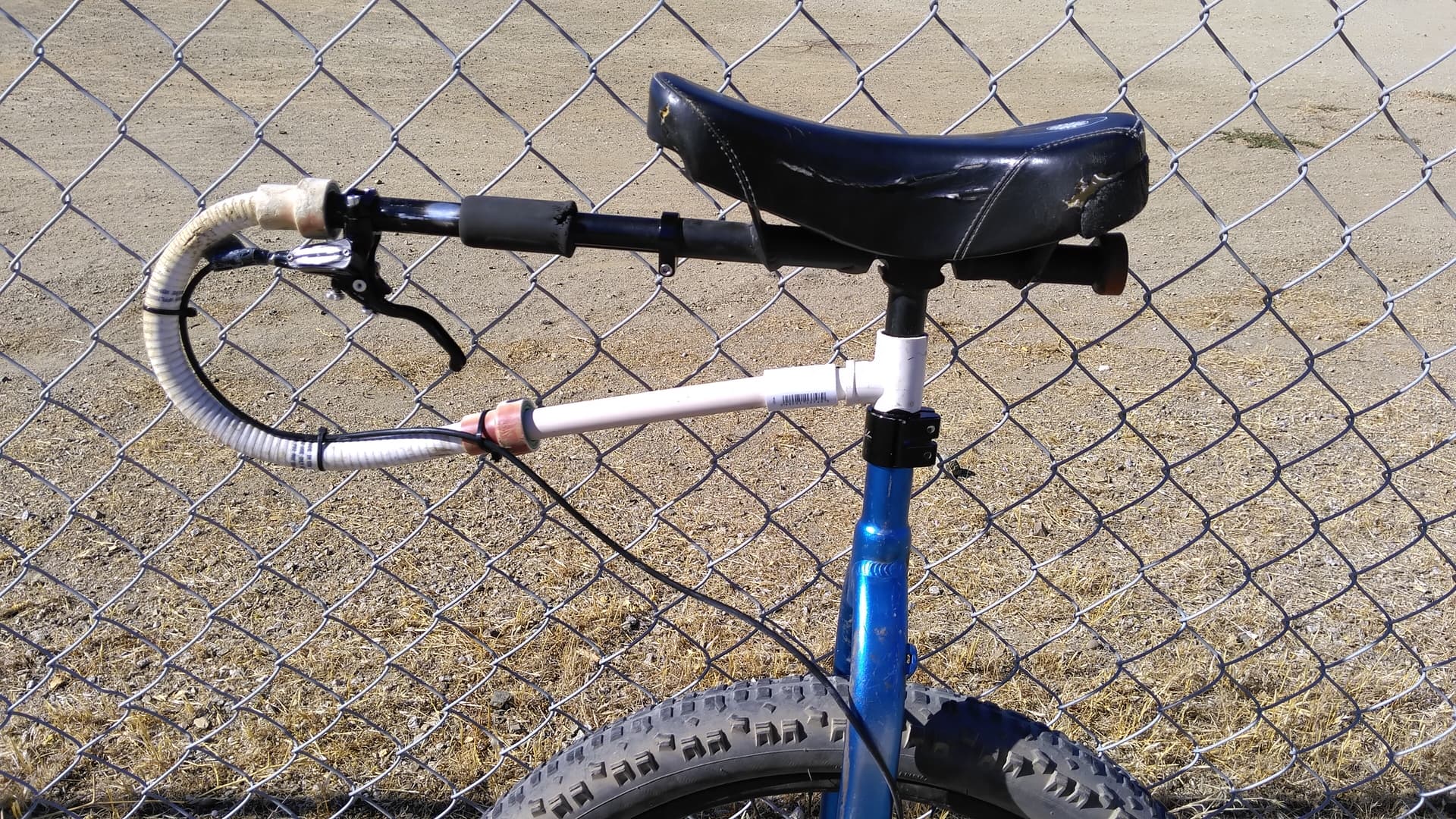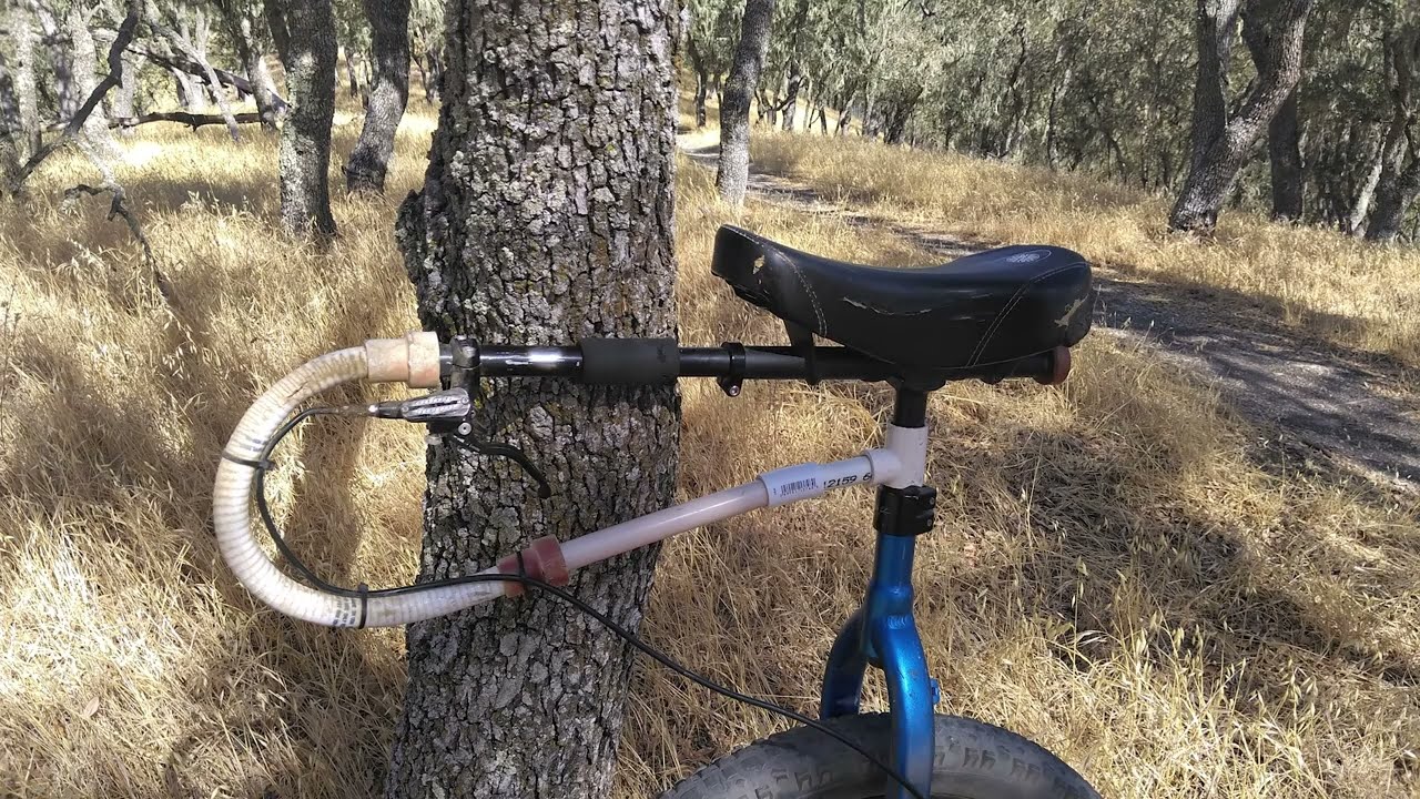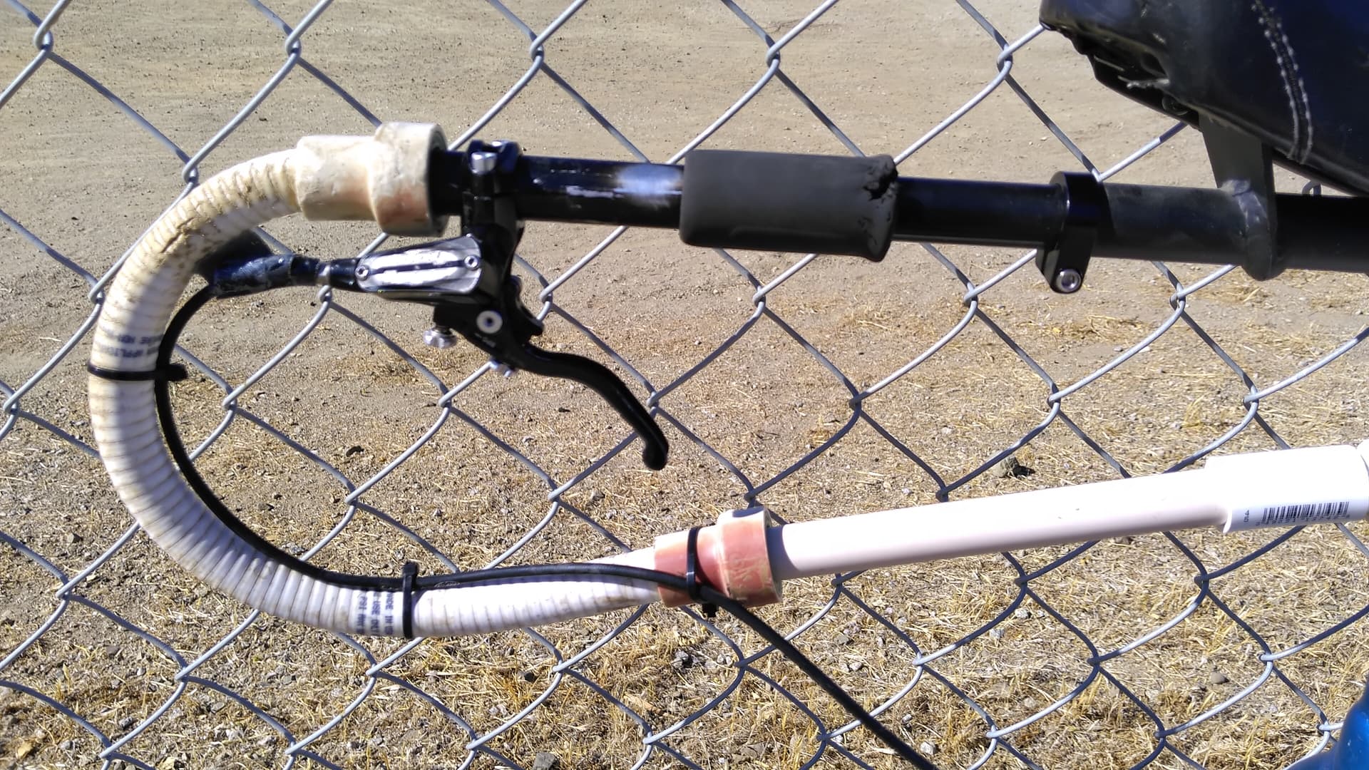 I wanted to post an update to this. On my first attempted ride this week I discovered I had forgotten to deflate the tire and it exploded in the back of my car. I replaced the tube and tire and then on my next ride my brake hose finally broke. I’m not sure if it was because the hose is too short and flexed too much or if it suffered from impacts (or a combination of both). For the adjustments I moved the handle to a different (Mad4One) frame. I added a little bit of length to the PVC pipe on the bottom. I realized the hose is actually the same length so I would have the same issue. Ideally it would be a few inches longer so I could run it up the frame better (without this necessary shortcut), but I added a couple zip ties to try to reduce the tension on where it connects to the brake lever. The housing for the hose is pulled away a bit so I added some Gorilla tape but I need to look up to see what would be better to protect the tube inside.