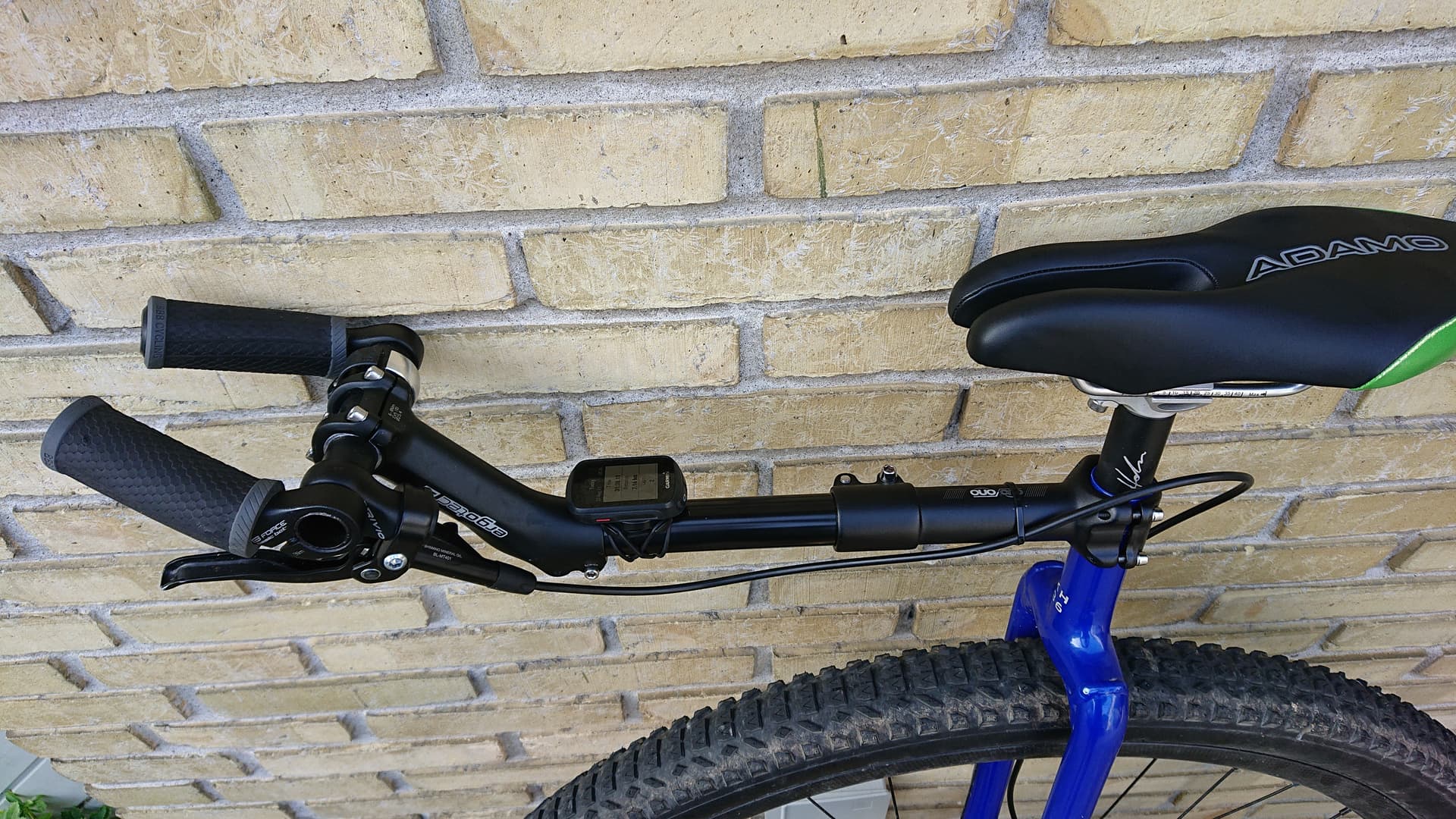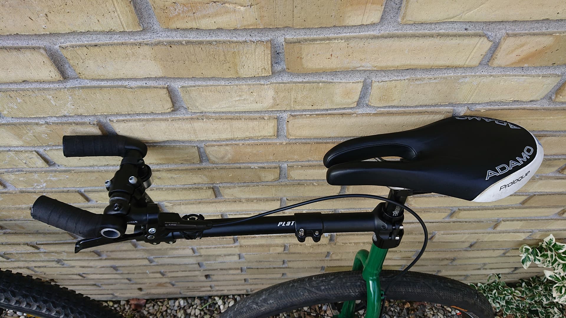 Also a “cockpit” view. If you look closely you can see the “clamping screws” on the 180 degree stem just in front of the nose of the saddle. I touch them slightly when riding and it’s the only minor issue I have with this DIY solution.