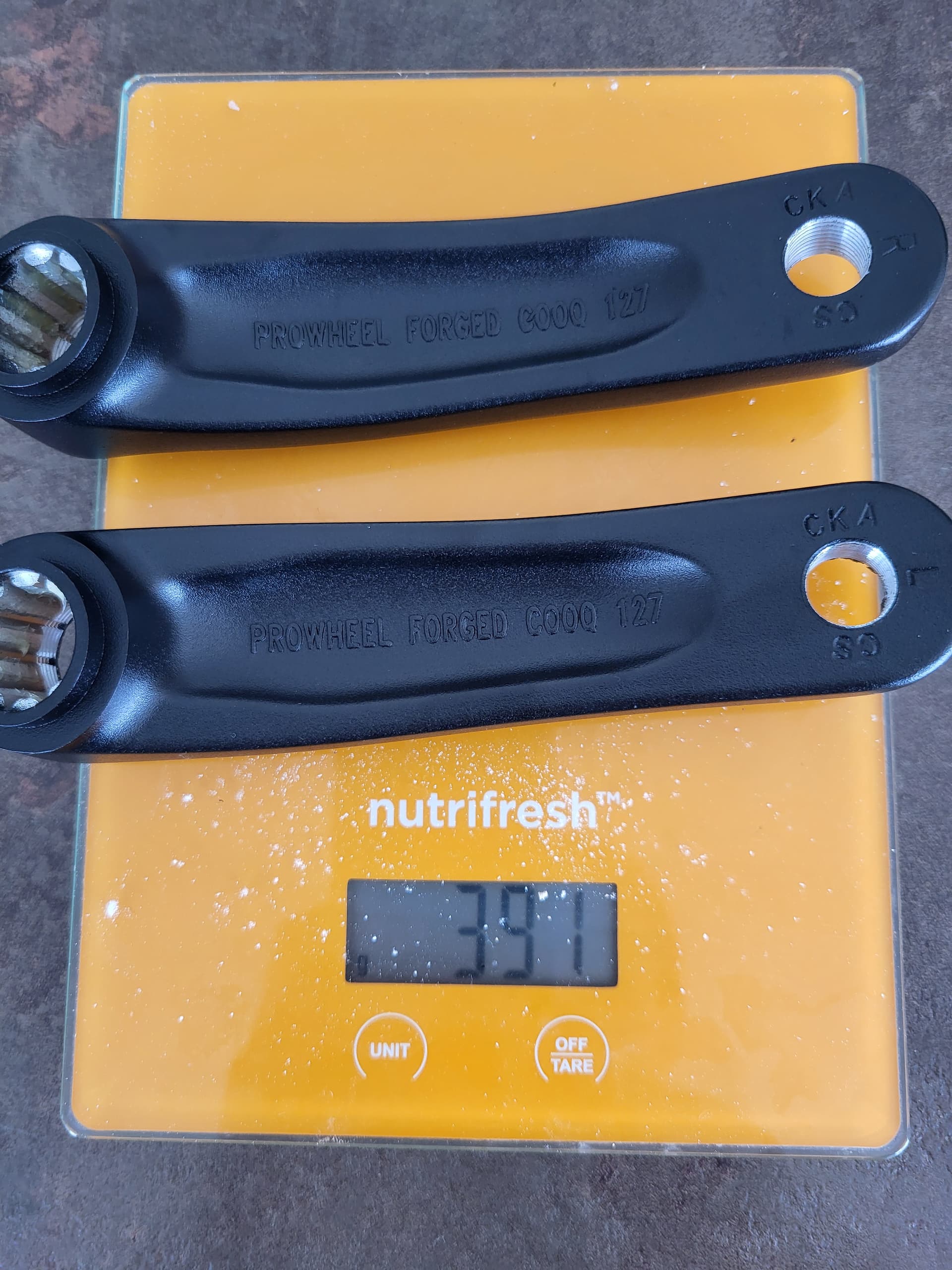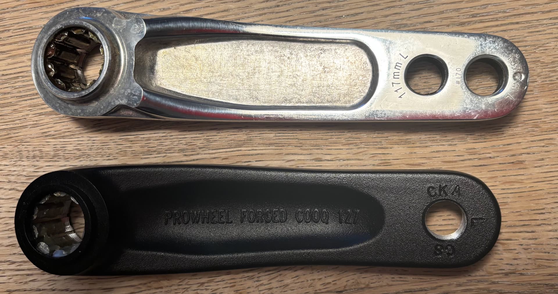 According to the listing, the Prowheel cranks are made with 6061, compared with the KH’s 7050. What that means for crank strength… I will leave for somebody else to explain since I am not too familiar with different grades of metal