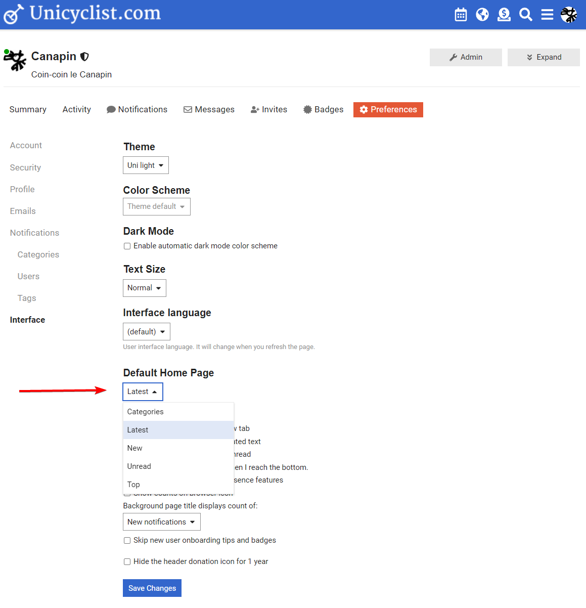 To do so, just go to your preferences https://unicyclist.com/my/preferences/interface and change the following setting to Latest or whatever floats your boat, and click Save Changes. ![]()