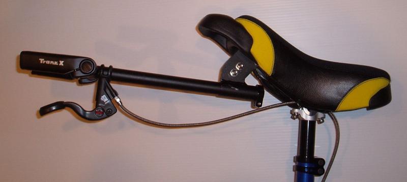 So far, I am not yet sure that a full, bike-like frame is needed since unlike a bike we are only supporting a handle, not a wheel, and strength seems adequate for at least the length of this production T-bar. For those of you who want to experiment with longer versions, the T-bar uses standard 22.2 mm tubing and it would be easy to make a different dimension of T-section and use all the rest of the existing hardware. A really long custom handle might require an additional reinforcement though, extending below the bar back to the frame.