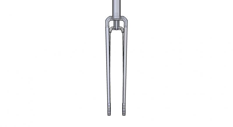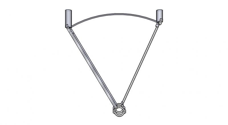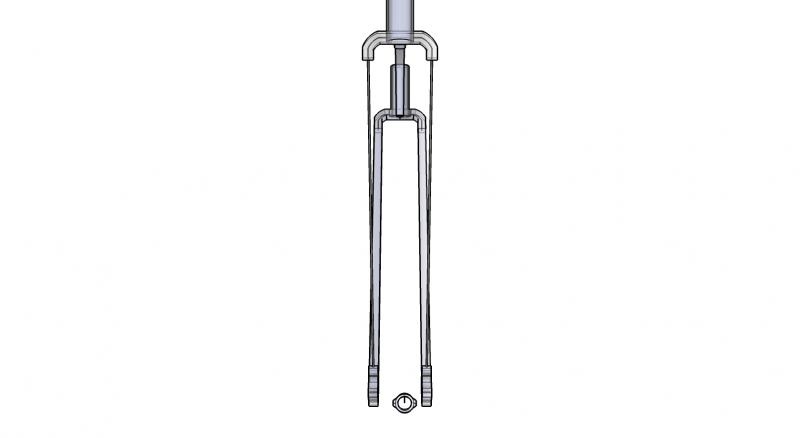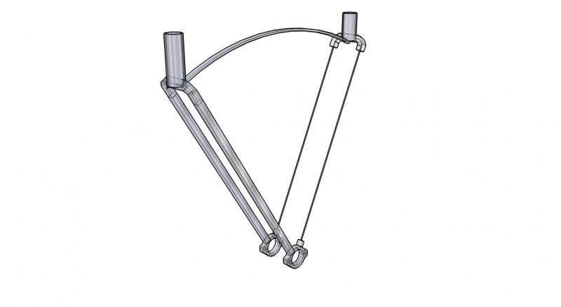 Well, here’s my new design with some quick sketchup photos attatched. The problem I am trying to solve is that I want to acheive the comfort and stiffness of a V frame but with the weight of a typical flat crown shaped frame. I acheive this by replacing the second tubes with 2 tensioned stainless steel cables anchored where the forward frame legs should be. I have a bar running to the handlebar tube and back to the seat tube to triangulate the frame to achieve this shape. While it isn’t in the pictures, I plan on attaching a mechanism to remove the top tube, enabling the entire forward piece to be removed and enabling the frame to be ridden in V mode and as a normal frame. Cable tension is adjusted at the bearing clamp anchor with a simple nut and bolt tensioning arrangement. Comments, questions, complaints, I’d be glad to hear them.