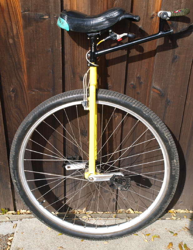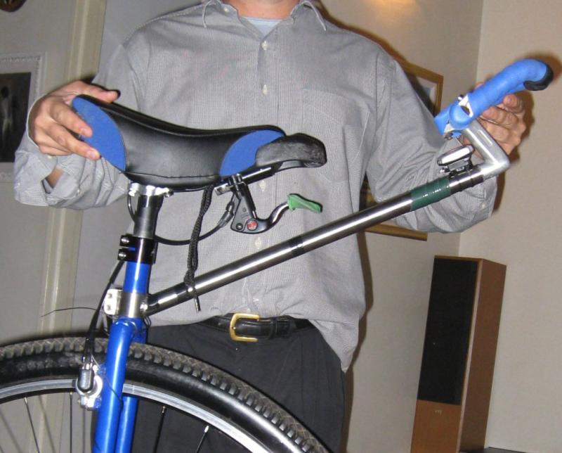 The Qu-Ax (silver) I welded a pole to a clamp, attached a brake to it, fitted a single bicycle handlegrip, and wrapped it with racing bike handlegrips.