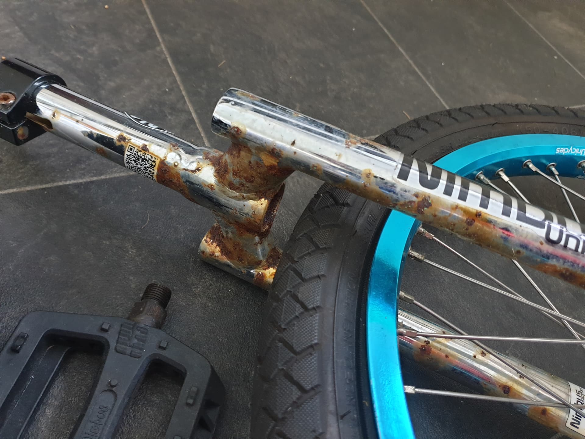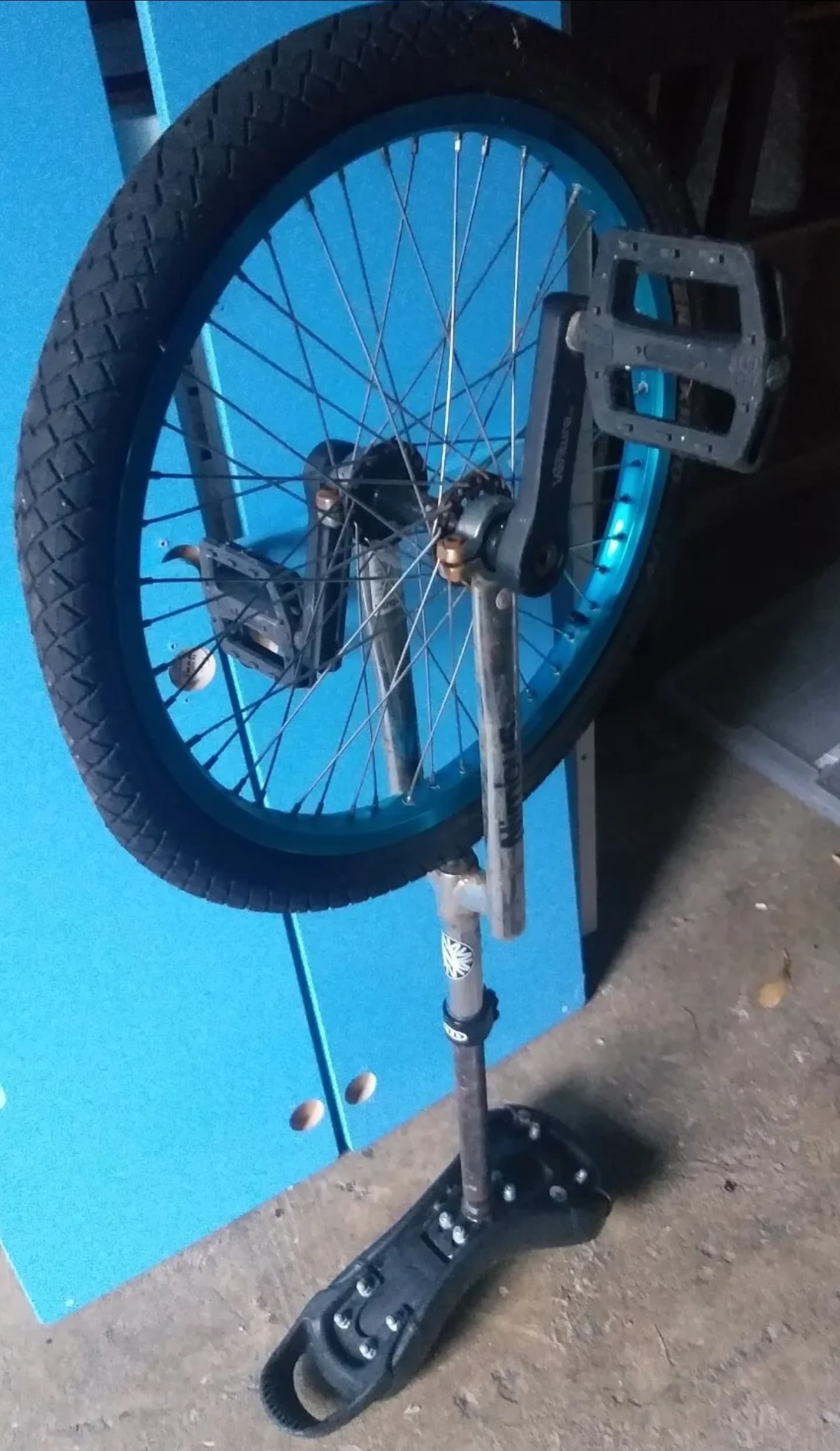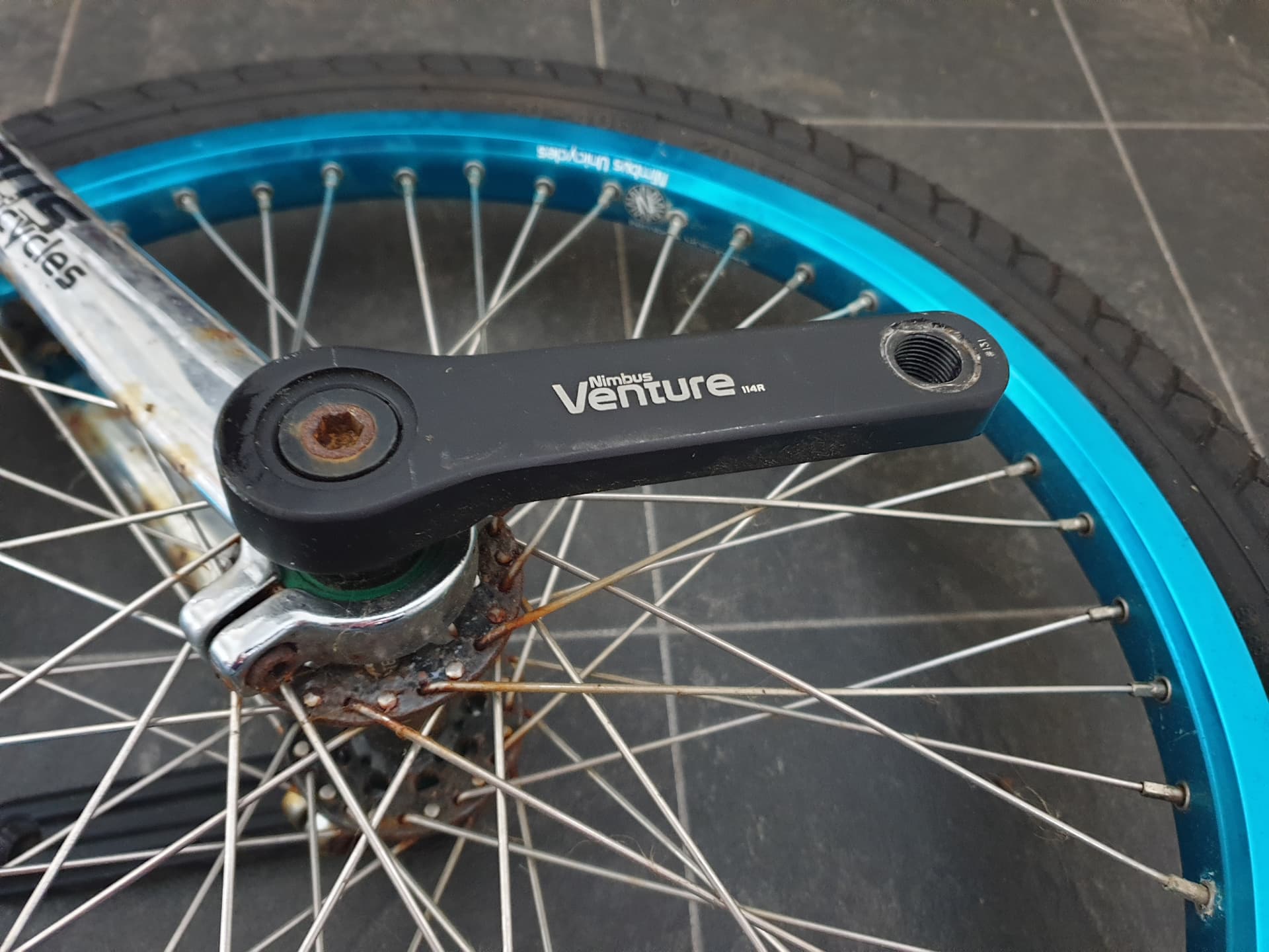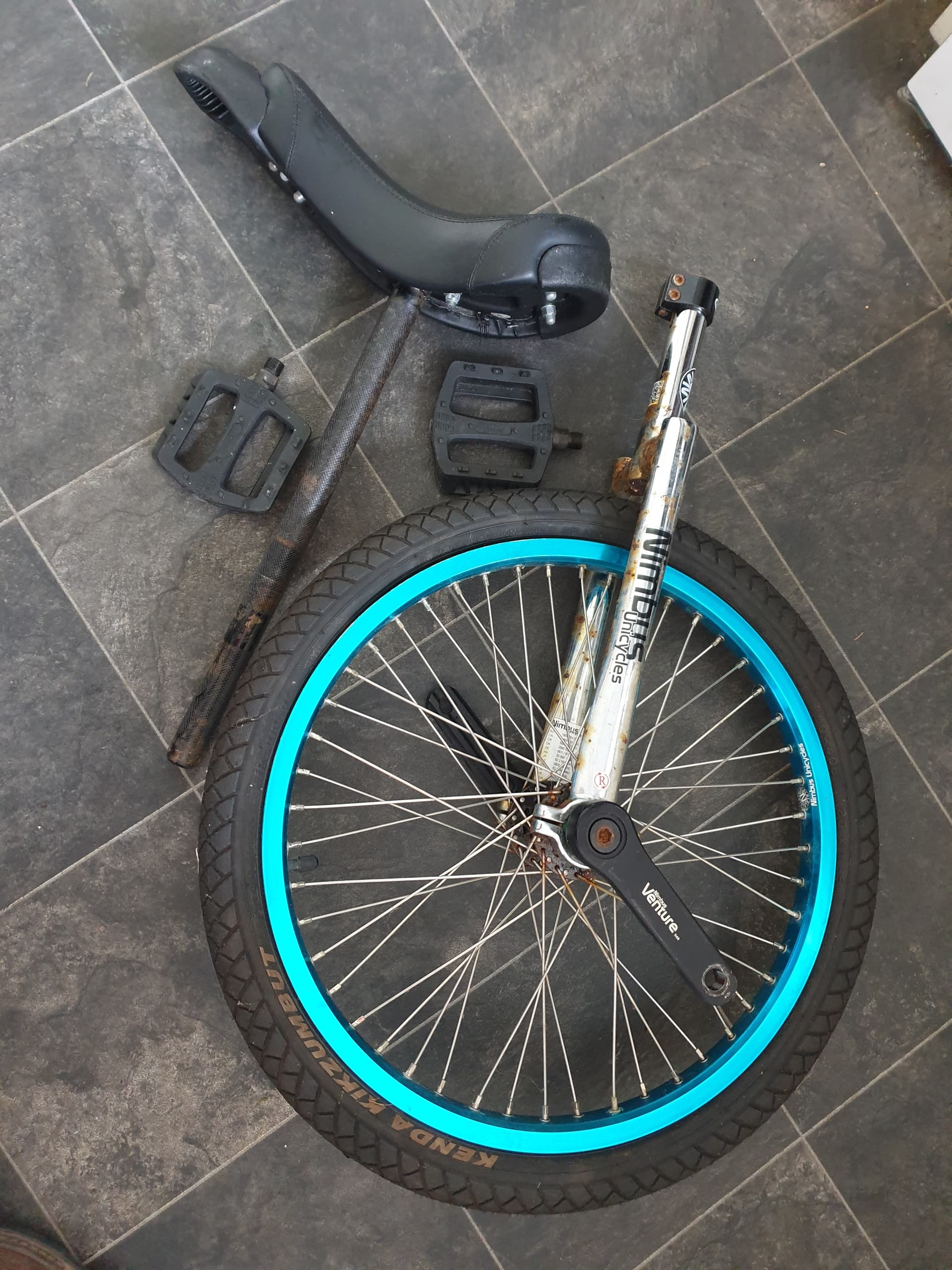 Well the project is progressing! I managed to persuade the seller of the uni I spotted as ‘Collection only - needs attention’ to box it up and send to me. So I’ve just taken delivery of a Nimbus II Blue 20" Freestyle. It’s probably well over 10 years old, rusty looking as expected and has a cracked front bumper, but other than that it looks fine, and it cost me all of £10 for the uni + £15 postage so I’m not complaining!