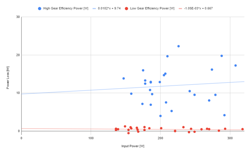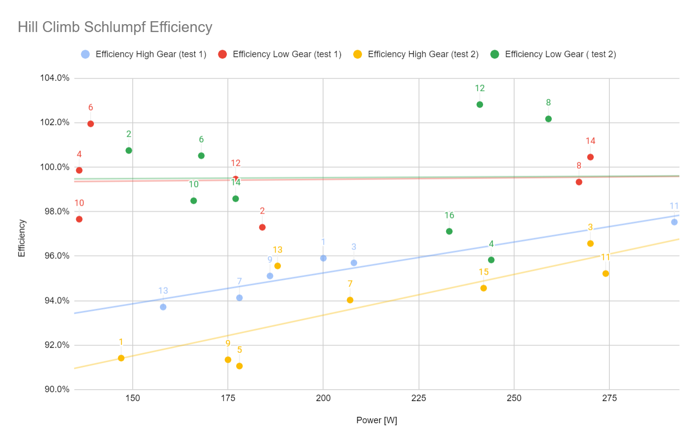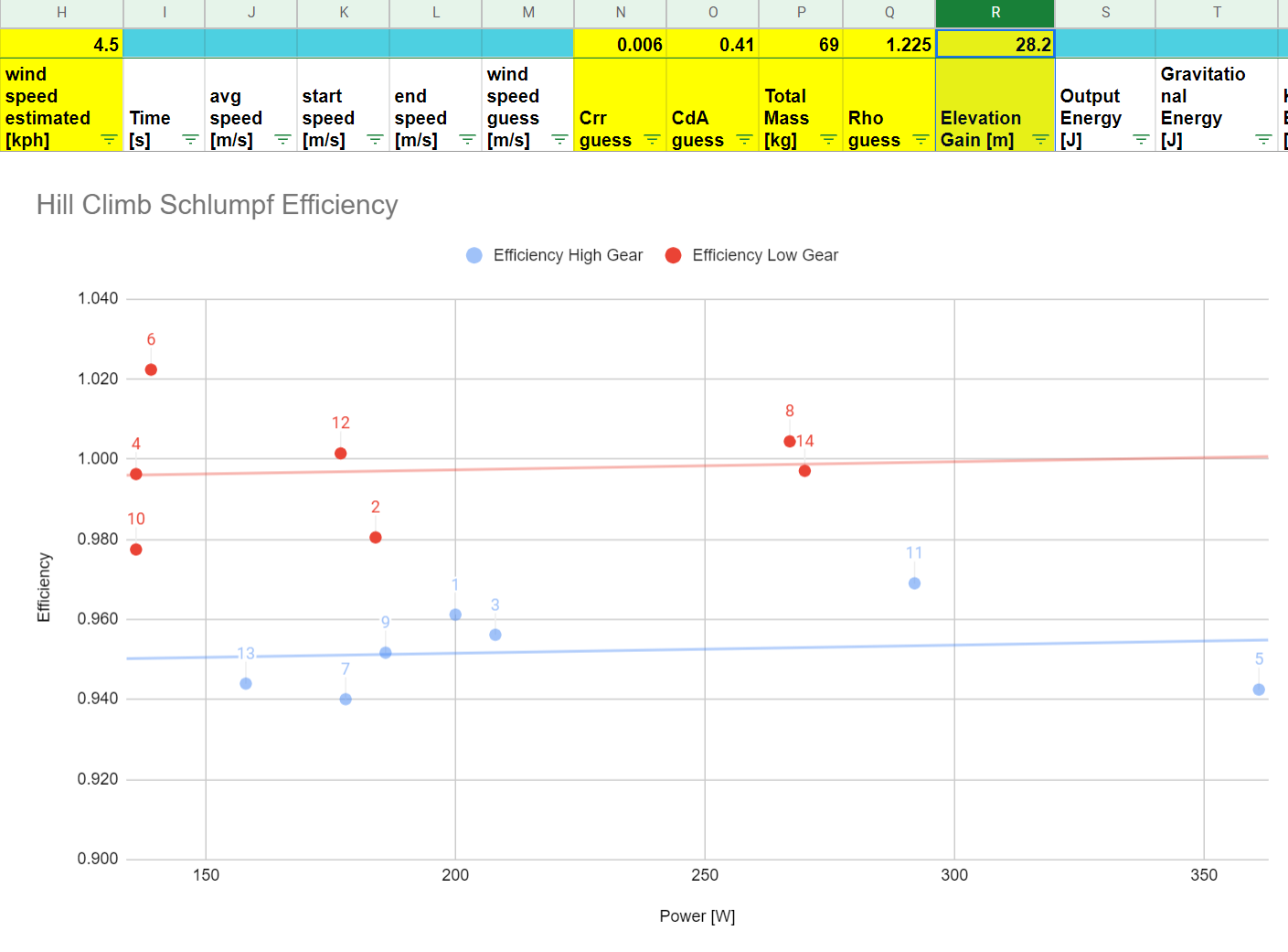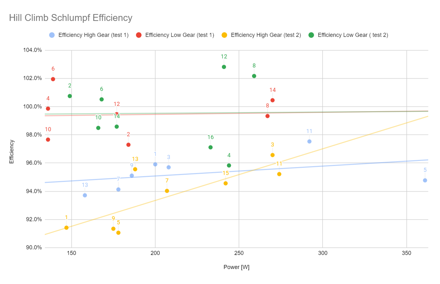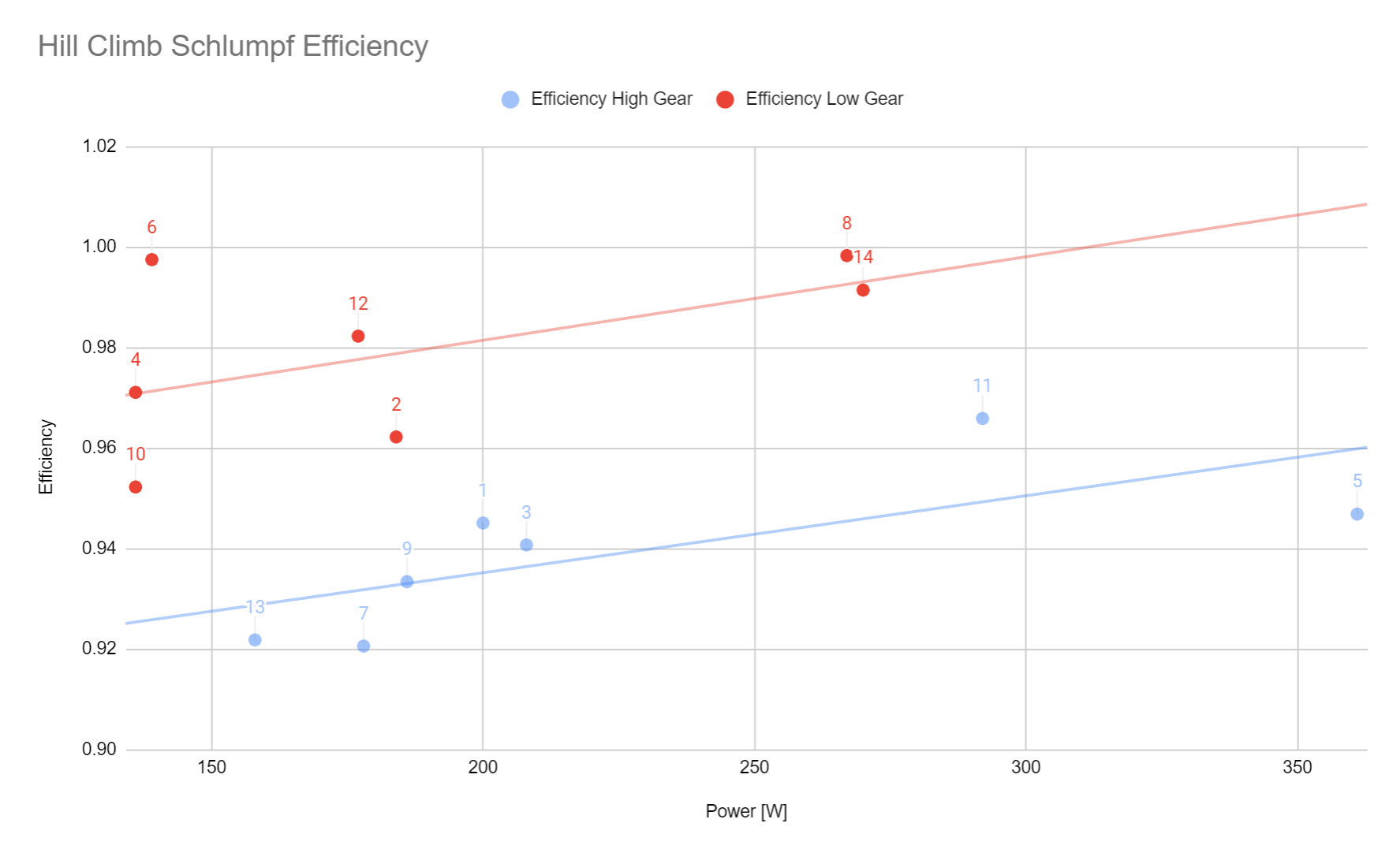 Surprisingly, I think the conclusion is decent! 4% efficiency difference between high and low gear.