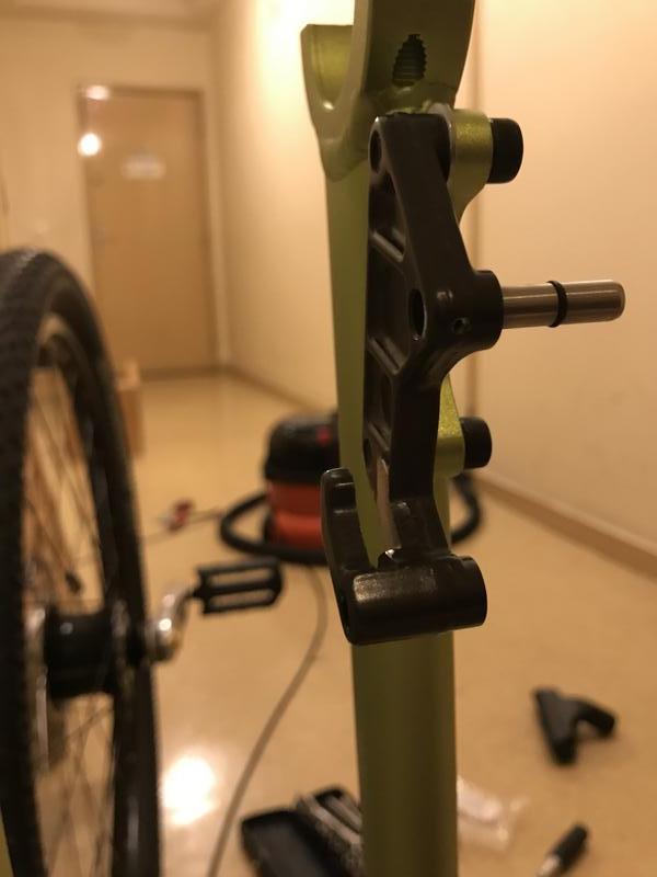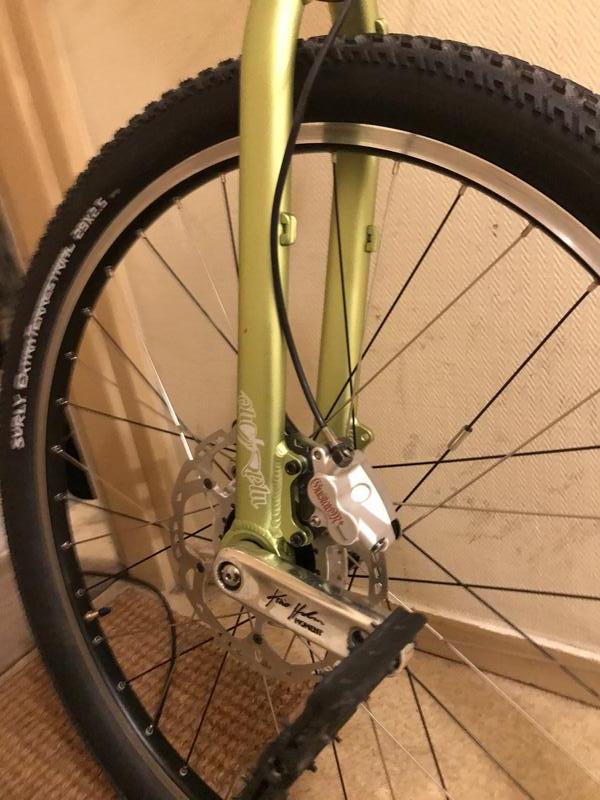 I still have to optimise the angle the caliper makes with the rotor with .2mm washers which should arrive by the end of the week. Magura’s literature claims there will be a constant rub noise but no actual rub: “the wheel can spin 10 rotations without stopping”. In my case, the angle is partly due to the frame not being super straight. An issue I had with my KH frames and which is also present on the Mad4One frame. I check the wheel in a truing stand, and it’s perfectly aligned…