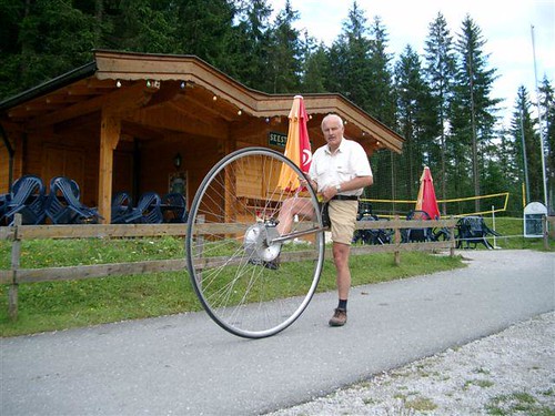 My old roommate had built a set of handmade big wheels, Tom Miller style. He had a 40", 50" and 56". Adding my 45" filled in the gap. Those were great novelty cycles for road riding, but not comfortable, not light, and the big one was not good for hills. Limited to 140mm cranks due to leg length, it was scary riding down even little hills! ![]()