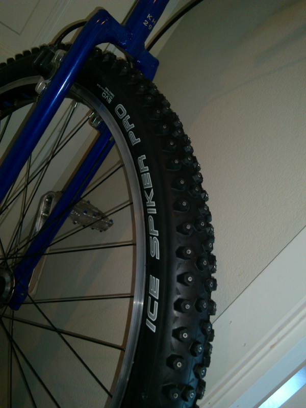I had the first ride today with my new tyre, Schwalbe Ice Spiker Pro which have 402 spikes in it. I rode 33 km on mainly hard packed snow and ice, but also asphalt and a frozen lake. I had amazing grip, much better than my old Nokian Extreme (294 spikes). I noticed the difference especially in sharp turns and climbs. It was also good on bare asphalt, no self steering.