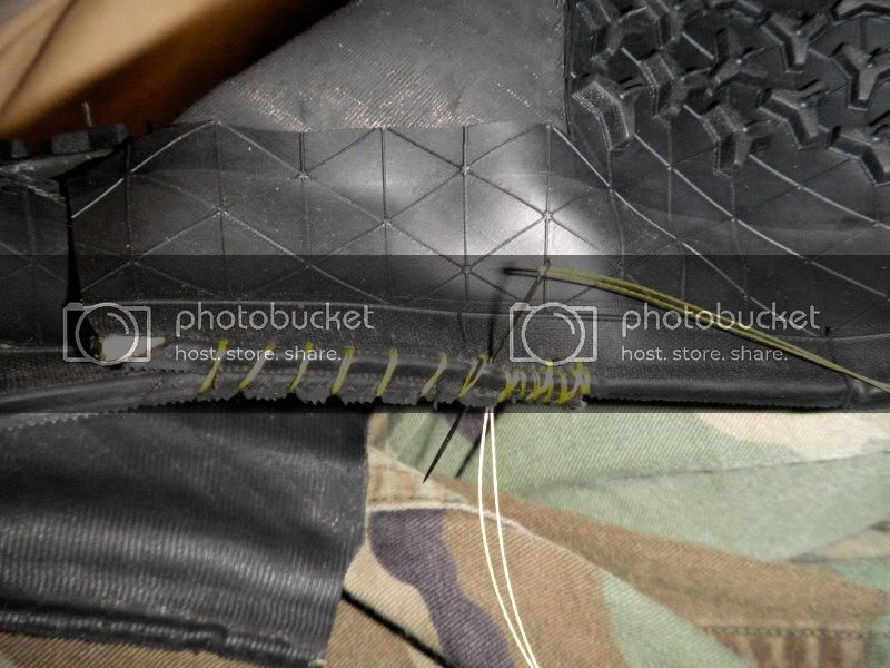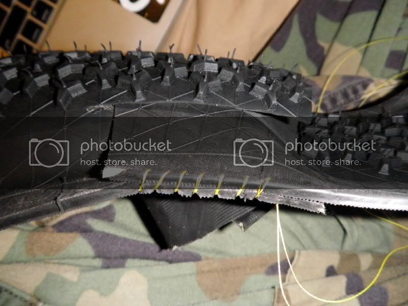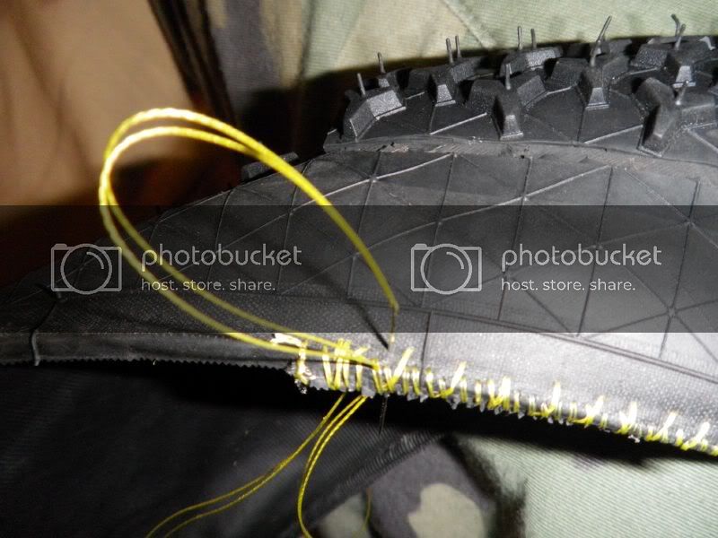Once the joints are all sewn up you can throw some glue in the joins and then mount the tire on a rim with a tube to squeeze the casings together ensuring a good bond. Let sit overnight.