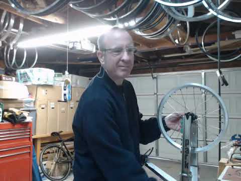 Now that your wheel is true lay it on it’s side. Thump one of the spokes with your fingernail. Now thump the one closest to it on the opposite side. Spokes are laced so if you thump the one on the outside on one side thump the one on the outside on the other side. Decide which one has the higher tension and make a note on a piece of paper. Do all the spokes this way. Your results will look something like this. U U D U D U U U If you end up with more of one letter than the other your wheel is off center. Give all the spokes on lower tension side 1/4 turn then repete the process.