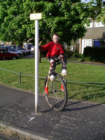 The original reason I wanted to sit him on the Coker was after seeing a stilt walker on a very tall bike. It left me wondering if an adult on very short stilts could ride an extremely large wheel, the cheapest experiment was to use a standard wheel and to scale down the human.