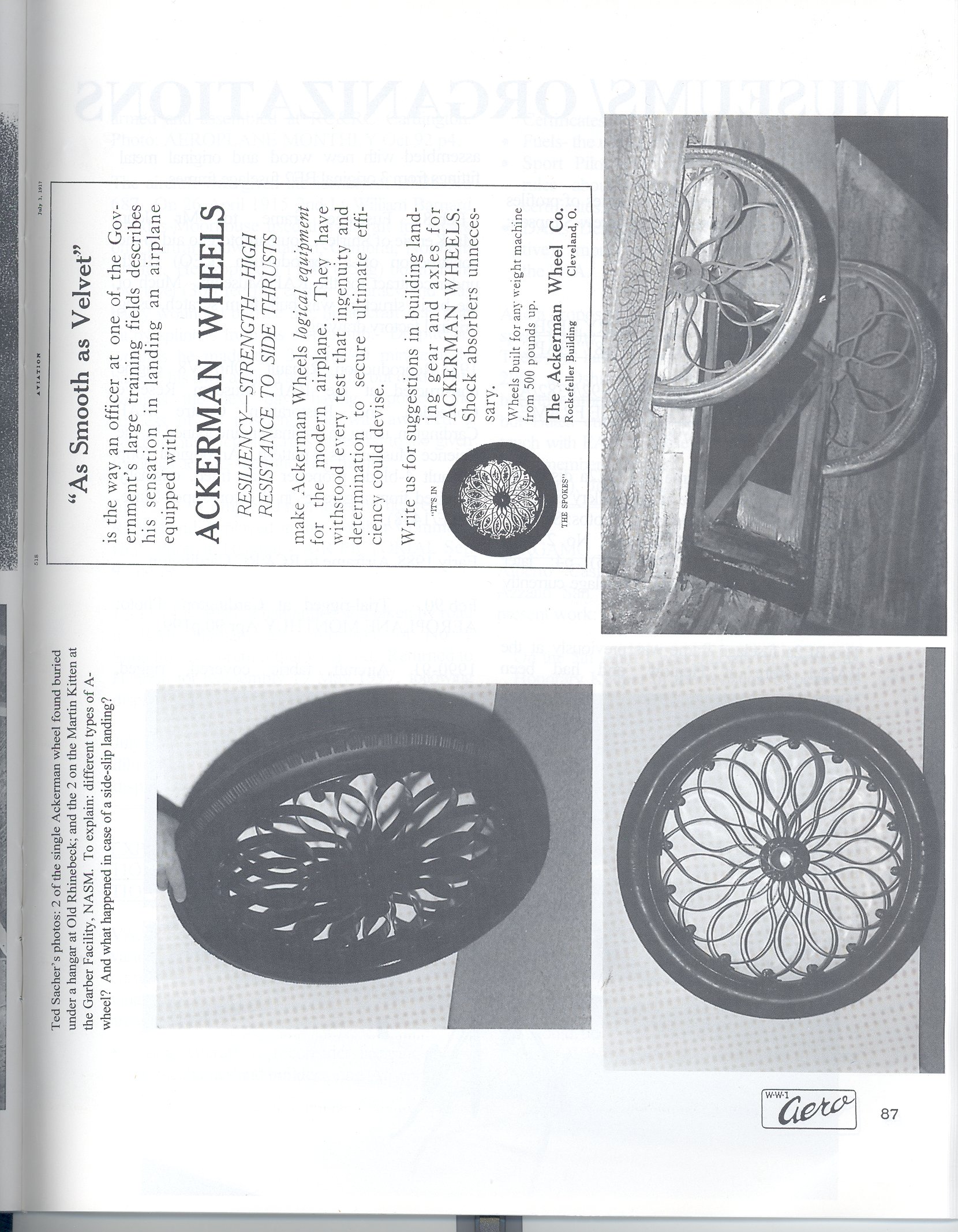 The Ackerman wheels were actually used in the J.V. Martin K-III “Kitten”, which was powered by a 2-cylinder, 45 hp motor and had an empty weight of only 159 kg (350 lbs). Although those wheels can’t have been as light as conventionally-spoked wheels, perhaps they were lighter than a combination of spoked wheels + shock-absorbers would have been? The wheels were incidentally part of one of the first semi-retractable landing gears ever used (1918).
