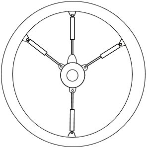 This is the idea someone else and I came up with. Basically the same idea as the first, with 6 hingest, 3 on the hub, 3 on the rim. But add a 4th shock which would be one piece with the hub and hinged at the rim. It would not contribute any spring to the compression. It would have no spring, no dampening. This is to prevent uneven compression. I believe this would allow for suspension inside the wheel, but would also keep the hub rotationally rigid to the rim. Let me know what you guys think.