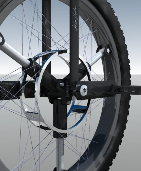 Now I am by no means an engineer, but if you’re trying to suspend the wheel as it is rendered in the above picture, would not all the weight go to the axle, sink it down, and then you’d just be on a shorter version of the unicycle?