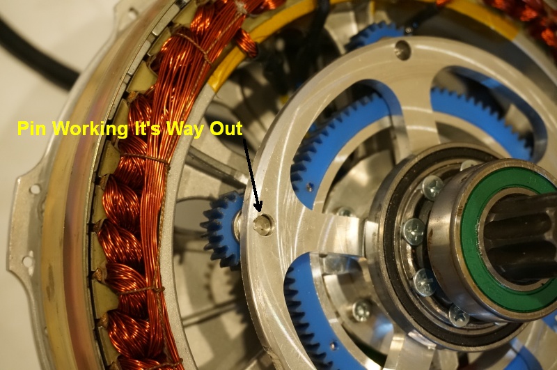 However, after this workout I could hear a regular “tick tick tick” sound coming from inside the hub indicating something mechanical rubbing. So everything came apart to see what’s up and it turns out that two of the press fit planet carrier pins were starting to work their way out of the plate, and the fronts of the pins were rubbing and wearing against the the motor stator support.