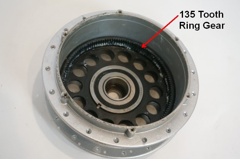 The ring gear is attached to the left side cover plate after some heavy modifications. Meanwhile, the sun gear is attached to the end of the hollow motor axle, which is stationary and doesn’t rotate.