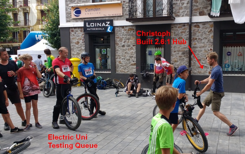 Well sorry that you didn’t get a chance this time around, but if you are in the US I’ll have it (or a future model) at the 2017 NAUCC event in Seattle next summer. The good news is that lots and lots of people at Unicon did get to give it a go and the feedback was super useful and for the most part positive. For anyone who had significant Schlumpf experience it was no problem to hop on and ride, but there were even a few people who had never ridden a geared hub before and managed after just a minute or two to be pretty comfortable on the machine.