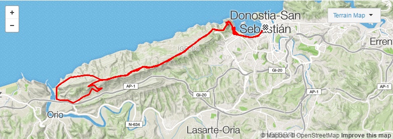 Where we were staying in San Sebastian there was what looked on the maps like a nice ride westwards with some good elevation climb to the town of Orio, which made for a ~40km return trip going from sea level to 1150 feet each way along a ridgeline overlooking the water.