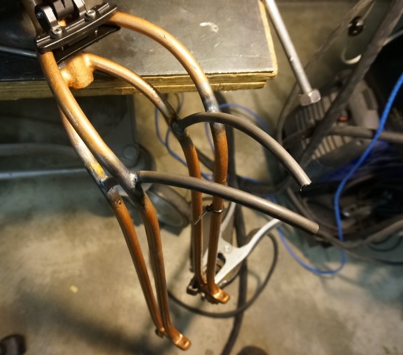 Rather than have the batteries hanging from a bag in the handlebar, I welded up an extra set of tubes to the frame so that they could be properly supported behind the unicycle. This also linked the two frame tubes together which increased the overall frame stiffness a good amount.
