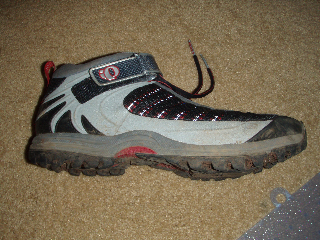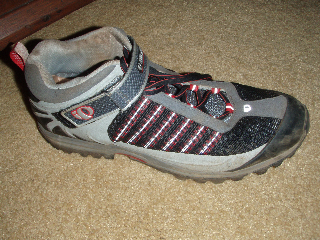 Pearl Izumi X-Alp Mid. Critter’s shoe above. This is an spd-compatible mountain bike shoe, that’s got a sole and tread closer to a flat-pedal shoe - made for hiking around in. The toe and sole are plenty stiff, but the tread and the arch aren’t quite as good for flat pedals as the others.