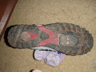 La Sportiva Cirque Pro. Tholub’s shoe above. These are climbing approach shoes, meant for sticking your toes into cracks. The toe and the sole are reasonably stiff, they fit my feet perfectly and they lace tight all the way to the toe, so there’s no movement in them. The sole and the tread are almost as flat as a bmx shoe, but there’s not as much protection on the side of the foot.