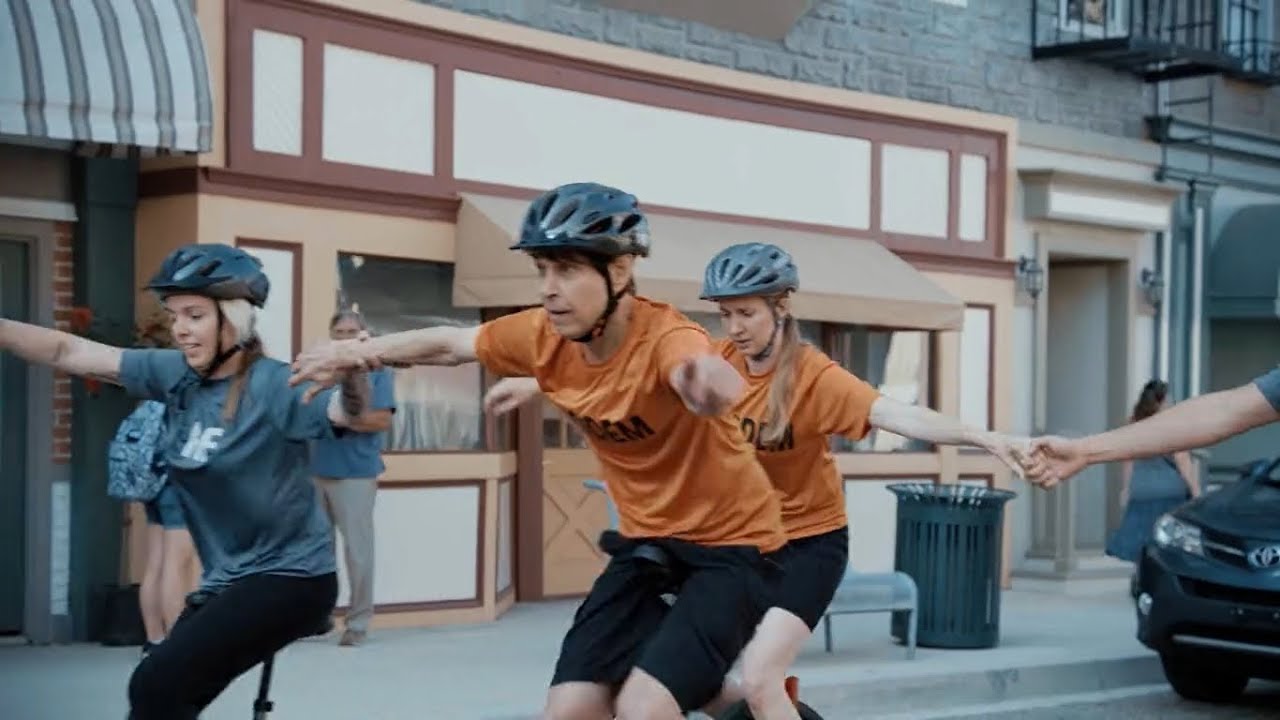 The tandem looks even weirder than the unicycles. They should have used a group of tempo cyclists. But of course, then the commercial would only have been 2 seconds long.