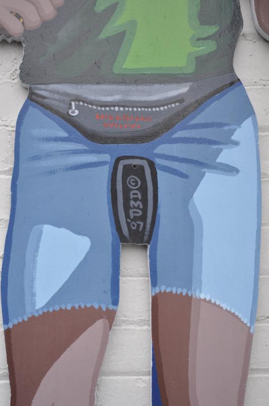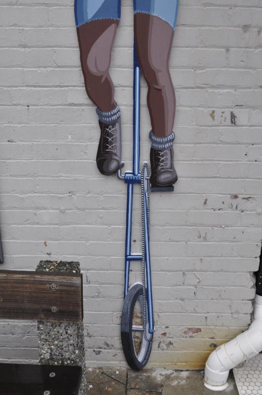 I was driving through Anacortes, Washington a few weeks ago. They have a city-wide mural project, which historical scenes are painted on wood cut-outs. As I passed through an intersection a “fiddling unicyclist on giraffe” mural caught my eye. The unicycle was well done but the post and seat don’t quite line up. The name painted in red on the front pouch says “Hillbilly Willy”.