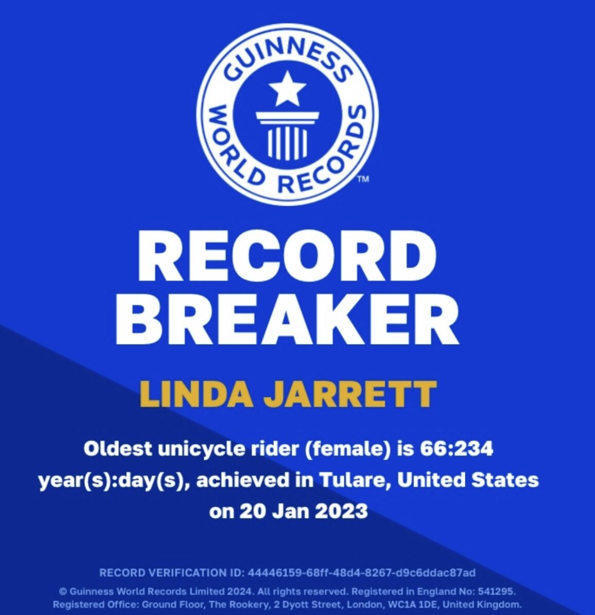 If you go to the Guinness, world records page, click the search bar type in oldest female to ride a unicycle. It’ll pop right up. My name is right there on top. I really can’t make this stuff up. The fact that it says 10 years later is this… I started applications about 10 years ago. I kept getting turned down for one reason or another… I have 14 applications in for different things Some were unicycle, and some Were other things. I finally got The record for oldest female, unicycle rider. that was the thing I finally finally got it after 10 years of Trying.… that’s where the 10 years came in if that doesn’t make sense I’m sorry.