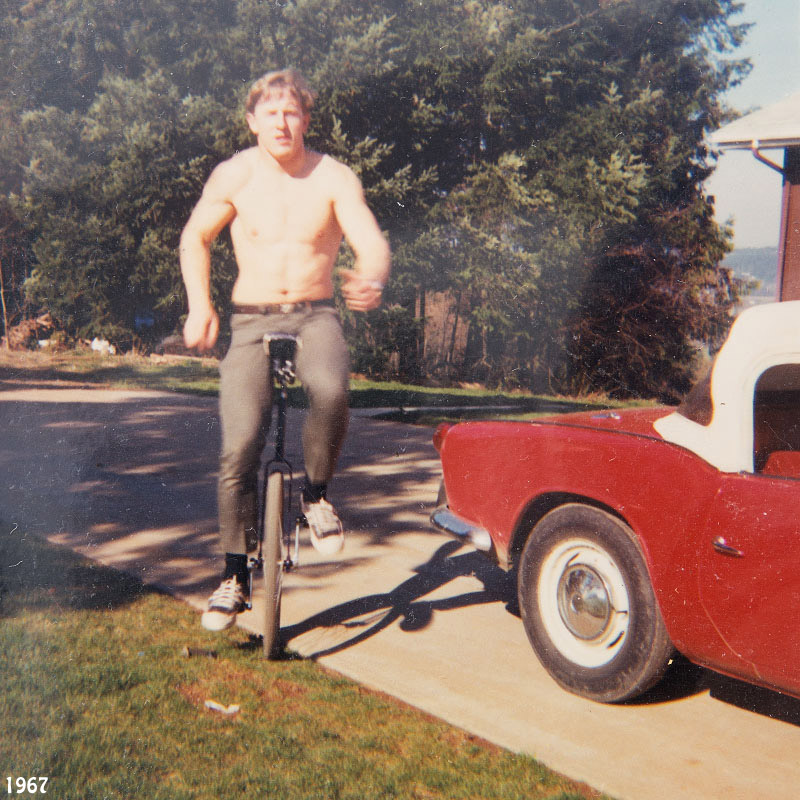 As a 49er unicyclist in my 75th year here is my story. I was a mediocre rider as a kid when I learning at about 10 years old on a homemade uni. I made first unicycle using an old tricycle wheel (about 12” diameter), some scrap metal I could find around the farm and an old English bike saddle. The only hard surfaces I had to ride were in the cow barn where I learned in front of the hay mangor and a short concrete walkway between the house and garage. I never ventured away from home and never even considered riding on a public road. After riding that first homemade unicycle for awhile I completely wore off the hard rubber tire and was without a uni for a few years. At 18 years old I happened to find a beat up 24” Columbia unicycle at a local store. I rode that a few times but did not put much time on it.