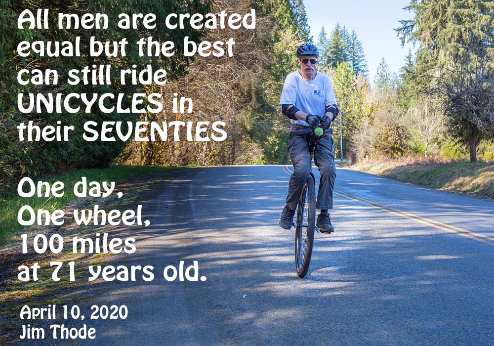 In addition to learning to ride/mount the 36er I have picked up a few other things in the recent years. I learned to idle, ride some backwards, jump mount, hop, ride comfortably with hands on a handlebar and ride for hours on end. An old dog can learn new tricks.