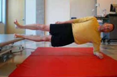 - Lift your right leg and left arm off the ground