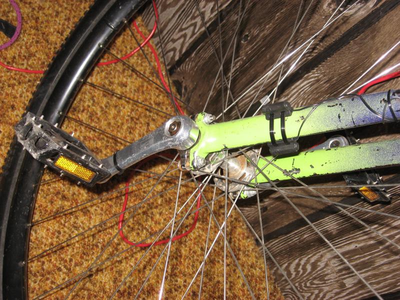 Oldschool steel frame, which was one of the lightest in fact, then drilled out airfoil rim, with a nightrider tire 29er tube, and the usual KH handle/seat setup. I’ve got three or four sets of cranks for it of the usual lengths, all aluminum.