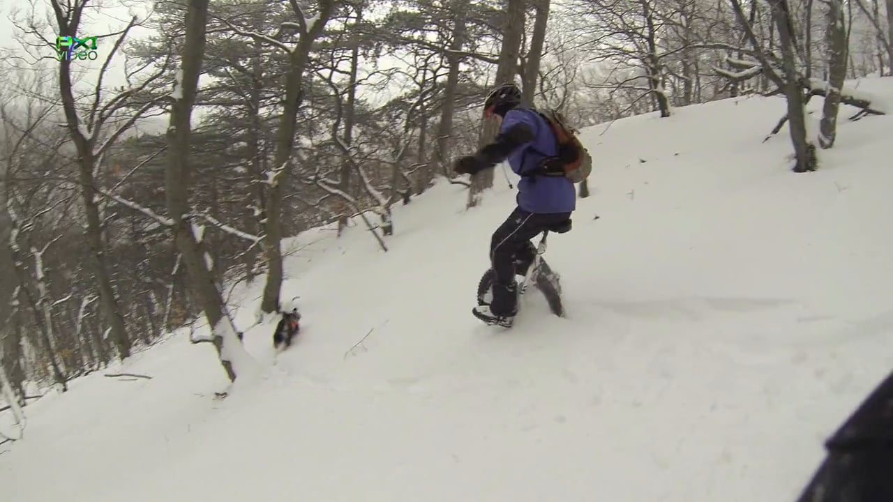 Tiefschneeabfahrt mit MTB und Einrad