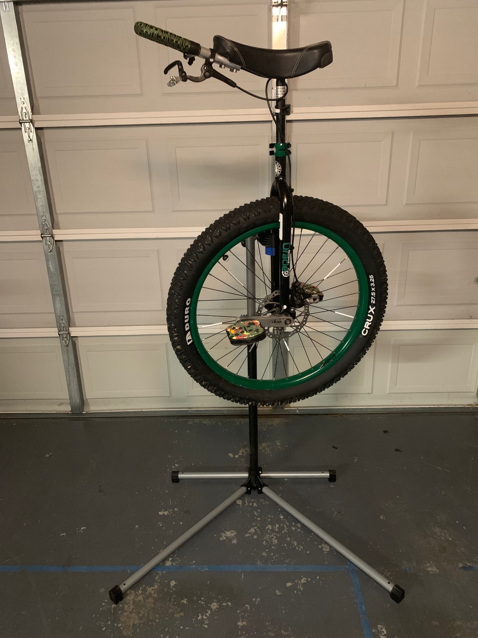 I don’t do it all the time but I have added weight in my free hand for a boost up on my 36er and more effective tight turns. In this video (first without a weight) I added 10lbs (4.5kg) in my free hand. When doing a rolling free mount with the weight stepping/jumping up was very very easy because of the added weight being thrown up and forward in my free hand.