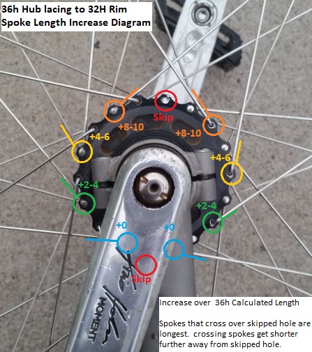 The spokes angling back over the skipped hole (2 holes away from the skipped hole - in orange) are the longest at about 8-10mm higher than the calculated 36h spoke length. This makes sense because they cross the extra distance over the skipped hole with the most horizontal angle. The next spokes angling over the skipped hole (4 holes away from the skipped hole - in yellow) need to be 4-6mm longer than a 36h spoke length. Proceeding away from the skipped hole more, there are 2 more spoke sets: a set that are 2-4mm longer, and a set that are the same length (or maybe +1mm) as a 36h typical spoke length. NOTE - the length differences are for a 29" rim and a Schlumpf hub.