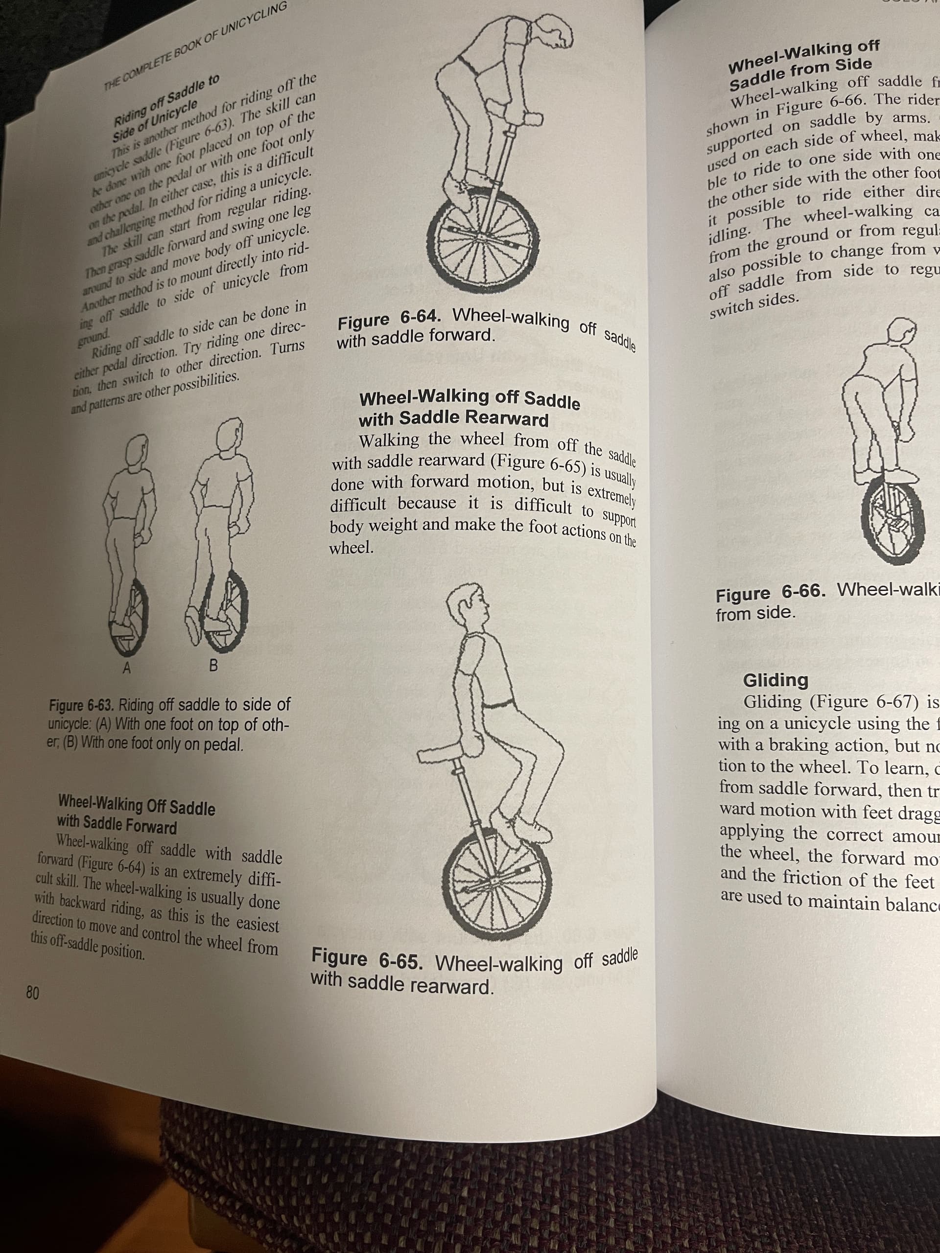 At the time your book was published, I’m pretty sure Jack Wiley was theorizing those tricks, and probably had never seen someone do them. There’s a good chance the people who pioneered doing these tricks were inspired by those crude illustrations, as I was inspired by the original The Unicycle Book (1973) and later by the Complete Book Of Unicycling (~1984).