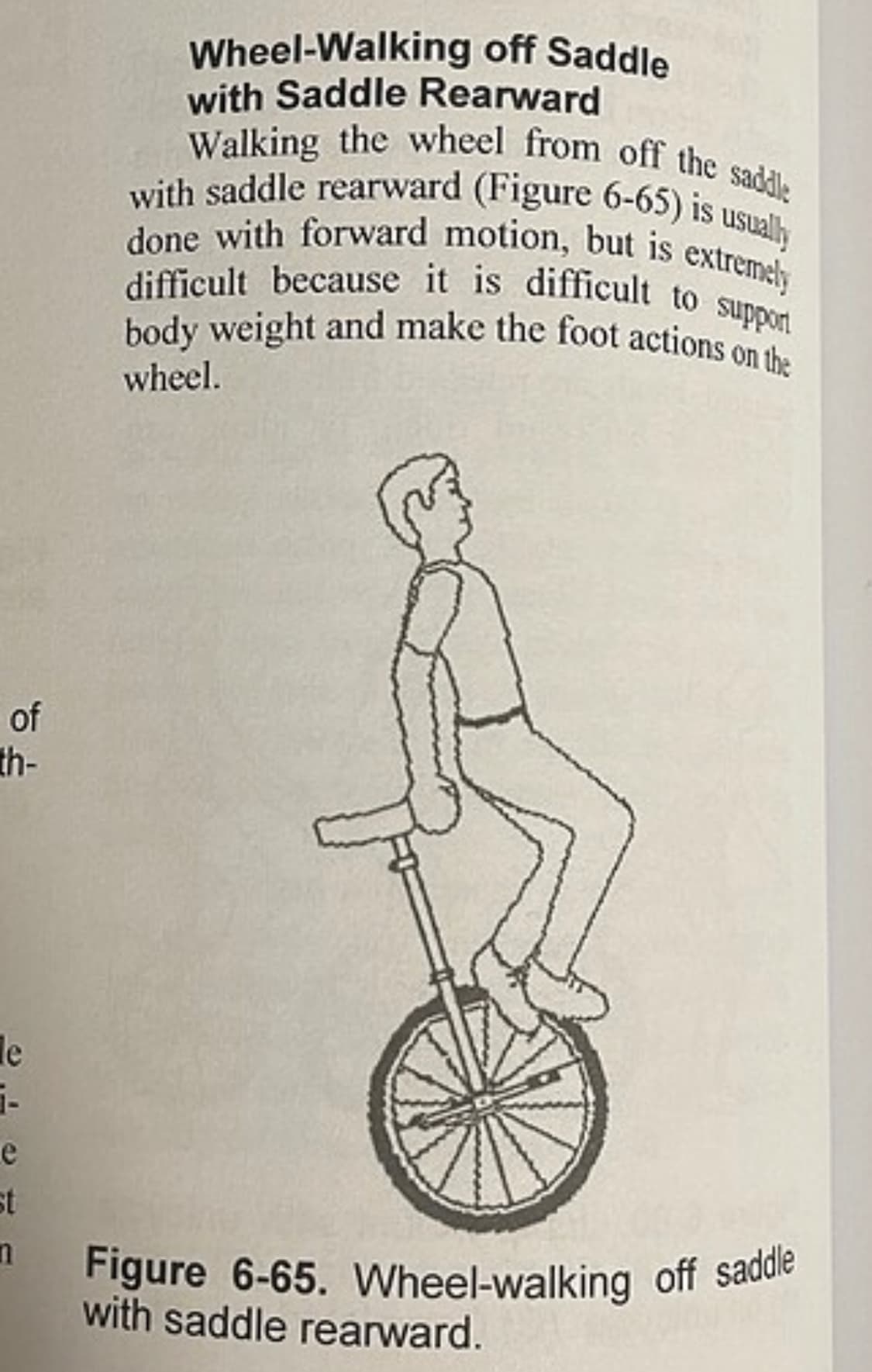 A while back I saw these tricks in this book I have. I’ve never seen anyone wheel walk off saddle with saddle rearward or forward, either in person or on video. I’ve searched the Internet numerous times and cannot find anything on this. A friend of mine suggested those were theoretical tricks. I can do a regular wheel walk and have been practicing one-foot wheel walking a little bit, but this seems extreme. Has anyone done this before? It’s a trick I really want to do at some point and just seems like it would be extremely awesome.