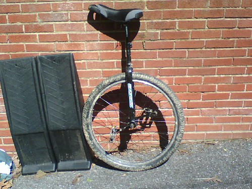 So anyways it sat for a couple months, during which i didn’t really ride the uni much at all. Then about 3 weeks ago, maybe as an admission of failure, i emailed Scott Wallis to see if i could buy a base. He said he’d probably be able to send me one about a month from then (about a week from now). Anyways, last week was “bike to work day” in my area, but since biking to work is what i normally do, i decided to mix it up a bit by unicycling to work. The 11.5 mile trip, while not the longest i’ve done on my AX, was somewhat less than comfortable. So i decided i’d try to finish the seatbase mods. I guess i was a little bolder with the dremel this time, since i’m already pretty commited on buying a Scott Wallis base anyways, so it didn’t matter so much if i ruined this base. Anyways, i carved for a little bit, checked to see if the bolts poked through, went back to carving, and so on. After several iterations of this, i was starting to lose patience (as i had in the past). So i decided to try it without the lower clamp/fulcrum piece. The bolts easily fit through with ample thread to go into the cylindrical nuts. There wasn’t any angle adjustability, since the seat base was sitting directly on the post itself, rather than the lower clamp. But the angle seemed pretty good anyways, so i went for a short ride in the park near my house. I did perhaps a half mile, going down curbs and over roots and bumps and stuff, but i noticed after a UPD near the end, that the seat was loose. D’oh! Anyways, I decided to remove a bit more of the material that was causing the interference and try again. After a couple more tries, i was able to thread both bolts at the same time, through both clamp halves and all. I quickly snugged down the bolts and reassembled the saddle to try it again. this time i went a little longer, doing about a mile’s worth of XC type trails, with a bunch of roots and bumps, and some somewhat technical (for me) downhills where i had to pull up on the handle. At the end of that, it felt just as solid as it had when i mounted it up, and just as solid as the AX stock setup. Wohoo!