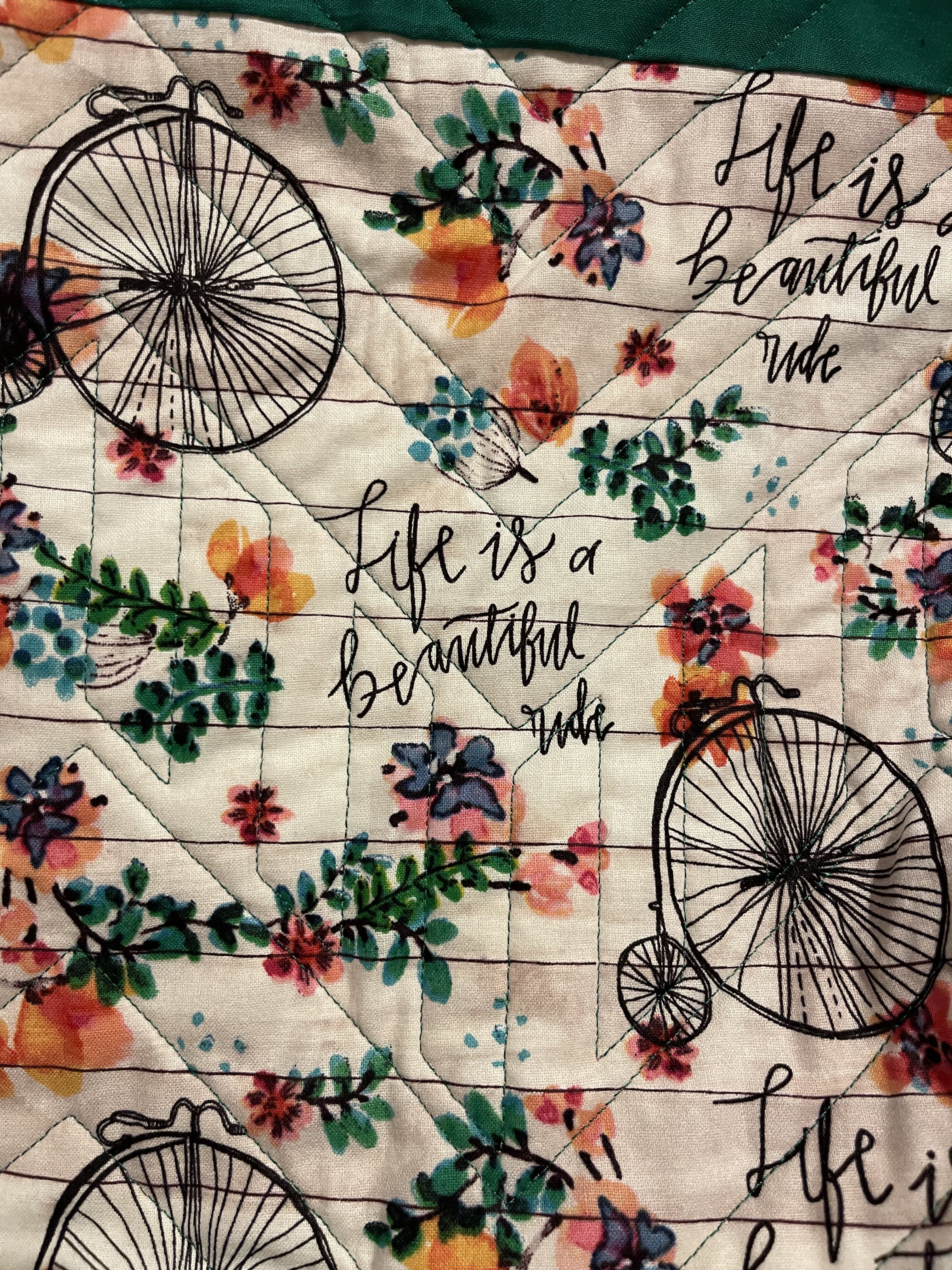 Unbeknownst to me, my quilter friend has a son who rides unicycles. I found that out after seeing this quilt in her sewing room. Lucky lad is getting this for his birthday.